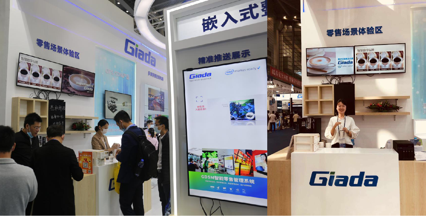 紧邻ARM架构商显产品集的精准推送展示区与零售门店模拟展区,共同组成了本届展会三亿科技展位的一大精彩设计。场景展现了GDSM智能零售管理系统在零售门店场景下的展示效果,顶部的数字标牌由GDSM系统推送内容,模拟搭建了针对人流动线的广告精准推送形态。