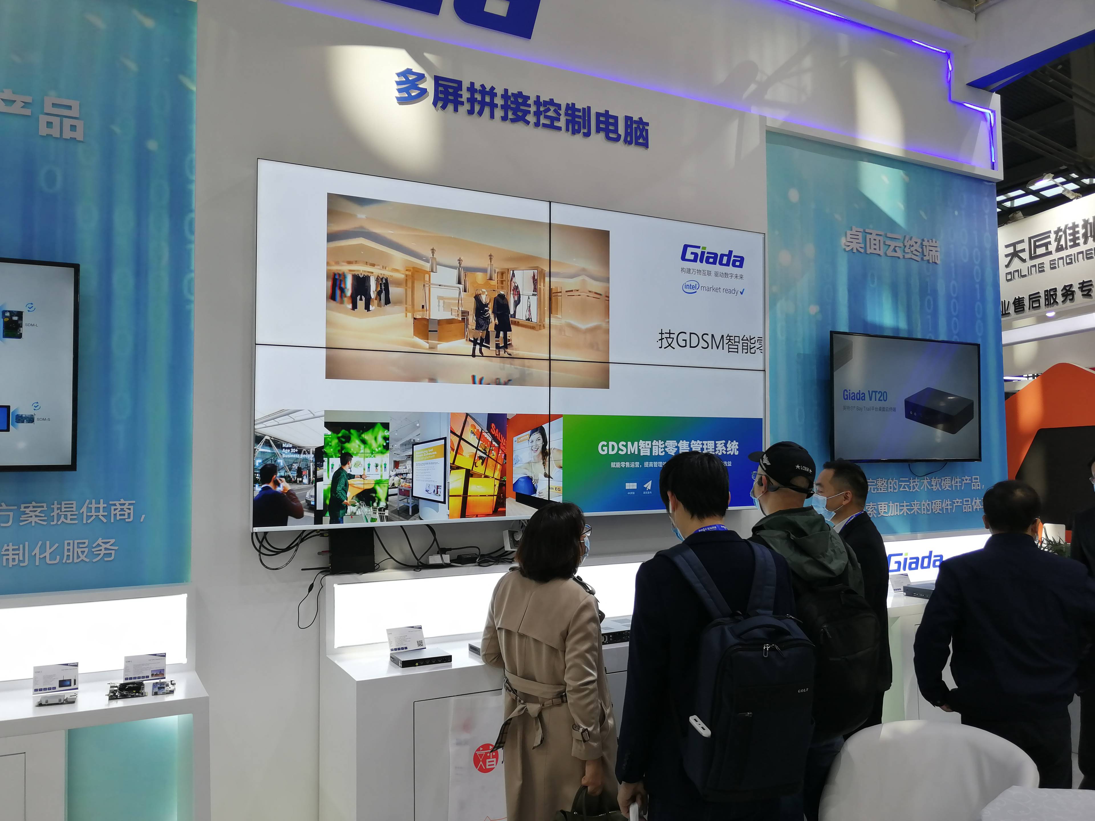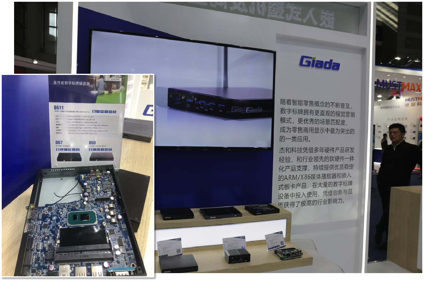 步入三亿科技展位,首先呈现的是三亿科技近年的商用显示ARM产品集和GDSM广告精准推送演示。三亿科技DN系列媒体播放器分别使用了瑞芯微RK3288、RK3328和RK3399三款核心芯片;全部采用116mm*107mm*30mm的紧凑外观设计,轻便灵活;搭载RK3399的DN74媒体播放盒具备双屏4K异显输出能力,DN75在DN74的基础上额外扩展了HDMI-in视频输入接口,支持画中画或投屏显示。三亿科技现场布署的所有单个屏幕都由DN系列媒体播放器作为信号源,GDSM智能零售管理系统下发的广告信息通过后台推送,再现了零售场景下如何管理多个分散布署的广告屏。