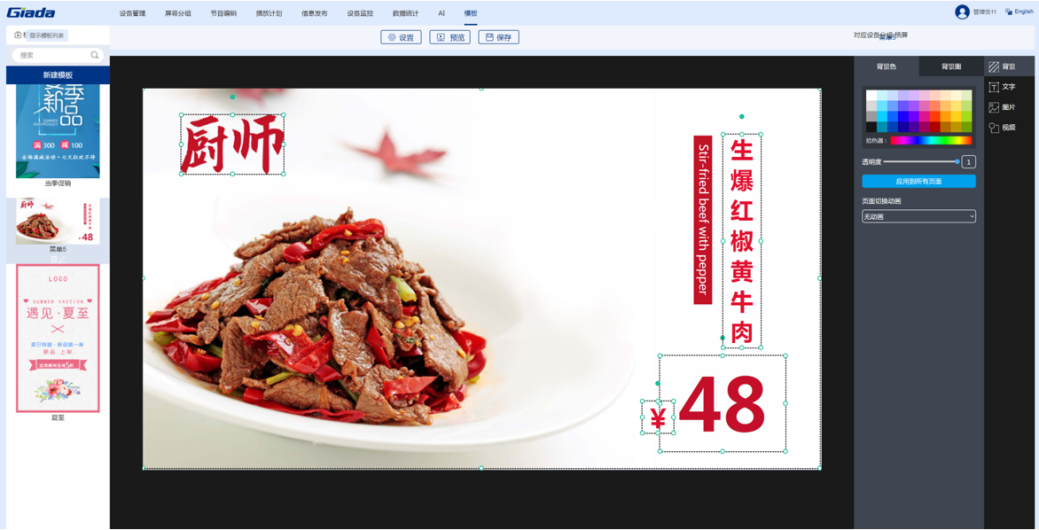 三亿科技智慧餐厅综合解决方案是由智能零售管理系统搭载公司自研的数字标牌播放器组成的软硬件一体化方案。该系统针对餐厅、酒店等不同行业提供典型节目模板,支持手机、电脑建议操作。用户只需3步即可完成节目的制作播放:选择节目模板,更换自己的素材(视频、图片和文字),预览保存及播放。价格、优惠折扣等信息可随时更改。