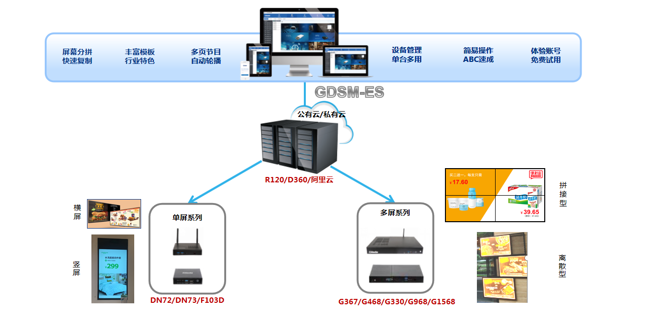 除了提供软件,三亿科技还可提供与该系统适配的媒体播放器,从商用级到工业级,从2k分辨率到4K分辨率,从多屏拼接墙到单屏点餐牌,从外挂播放器到可插拔模块,品类齐全。
