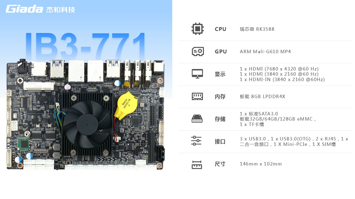 三亿主板IB3-771内置瑞芯微新一代旗舰级高端芯片RK3588,6TOPS算力的NPU,具有高算力、内存大、超强多媒体、多重扩展等技术优势。支持主流深度学习框架,能够为各类养老 AIOT 应用场景提供更优的性能表现。